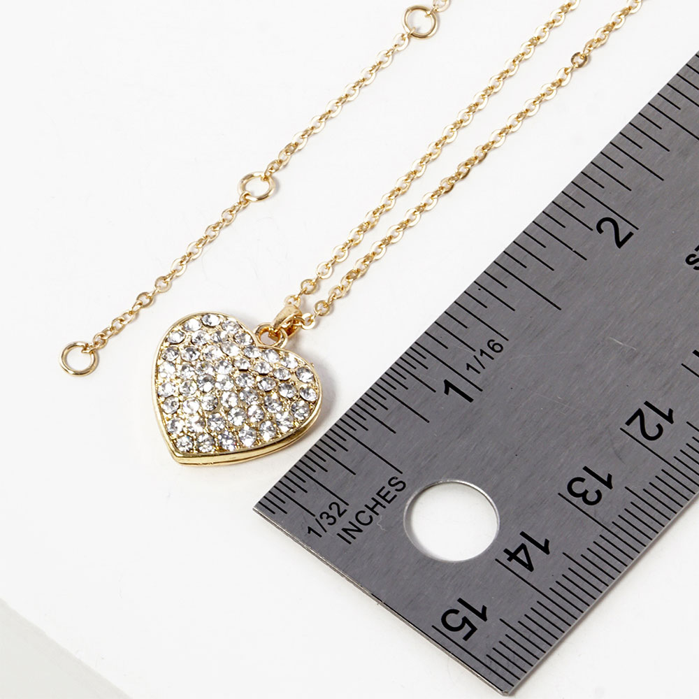 Details • Necklace Size : 15.5" + 2" L • Pendant Size : 0.75" X 0.8" • Charming heart pendant necklace featuring a sparkling rhinestone design on a delicate chain. A timeless accessory that adds subtle shine to everyday outfits and special occasions. Perfect as a gift or personal keepsake. • Lead and Nickel Compliant