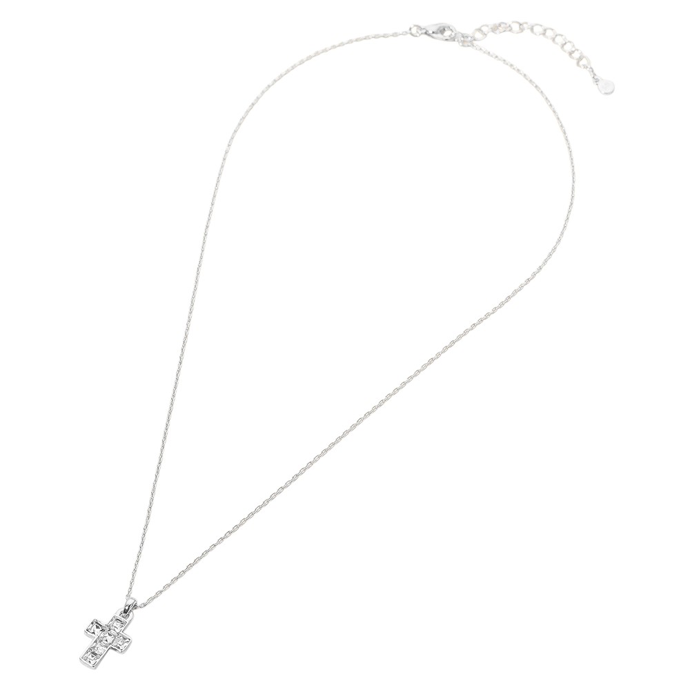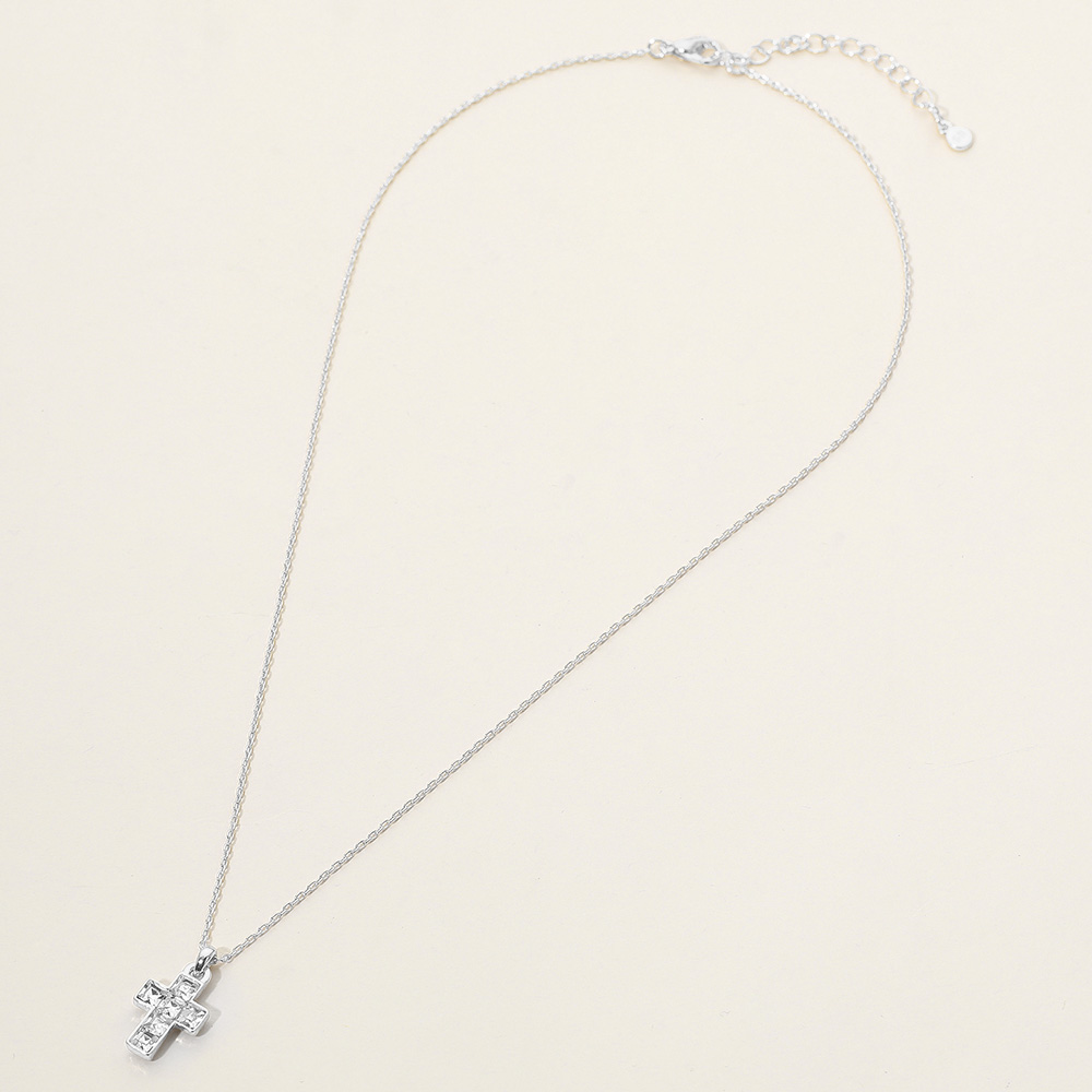 Details • Necklace Size : 16.5" + 2" L • Pendant Size : 0.4" X 0.75" • Embrace timeless elegance with this sterling silver dipped CZ cross necklace. The radiant pendant features a geometric arrangement of sparkling cubic zirconia, blending faith and sophistication in a refined design that’s perfect for layering or gifting. • Sterling Silver Dipped