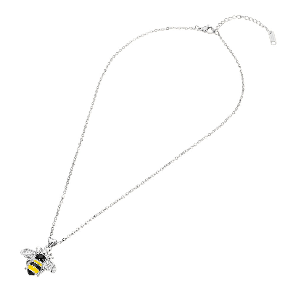 Stainless Steel CZ Stone Paved Enamel Honey Bee Pendant Necklace
