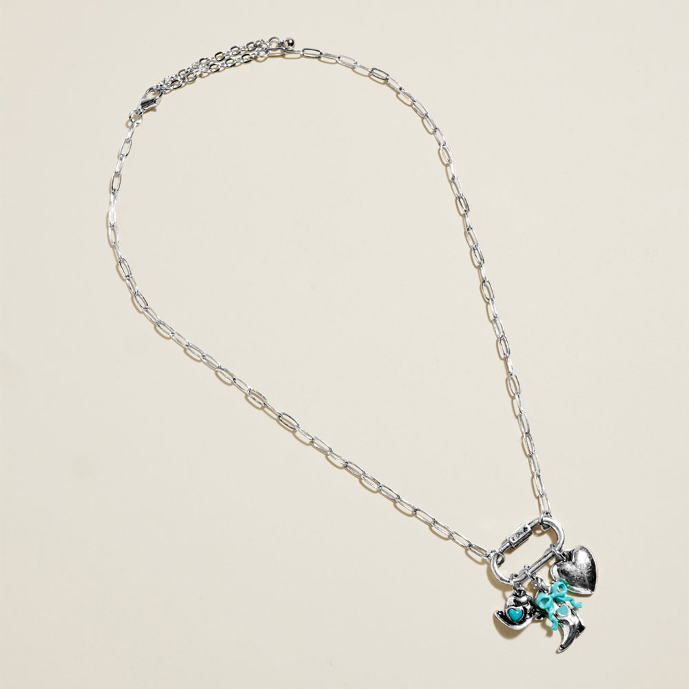 Details • Necklace Size : 16" + 3.25" L • Pendant Size : 1.25" L • Chain necklace showcasing a trio of dangling charms gathered at the center for a playful Western-inspired accent. Designed to add movement and personality, this piece layers effortlessly or stands alone as a subtle statement for everyday wear or styled looks. • Lead and Nickel Compliant