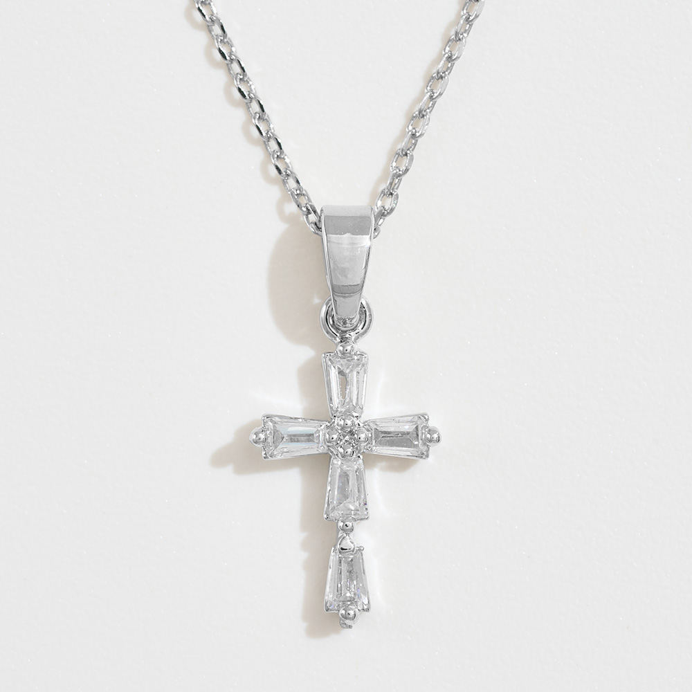 Details • Necklace Size : 16" + 2" L • Pendant Size : 0.4" X 0.7" • This cross pendant necklace showcases a sleek design with baguette-cut stones for a refined, modern touch. A timeless symbol of faith, it’s perfect for everyday wear or as a meaningful gift, offering both elegance and radiant brilliance. • CZ Cubic Zirconia • Gold Dipped • Made In Korea