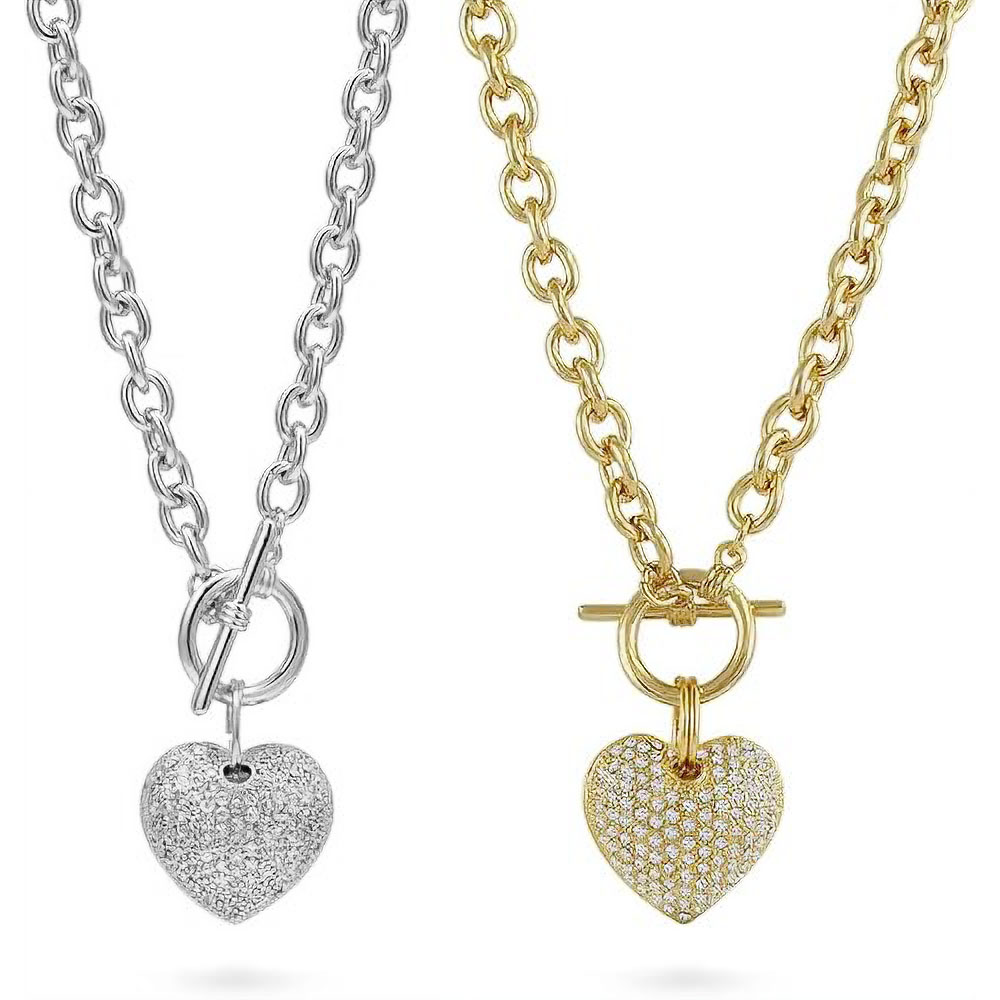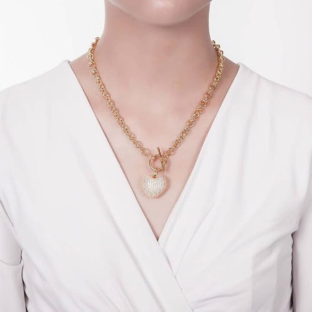 Details • Necklace Size : 18" L • Pendant Size : 1.2" X 1.6" • Elevate your style with this chic Heart Charm Link Necklace, featuring a bold chain design and a sparkling heart pendant for a touch of romance. Perfect for layering or wearing solo, this statement piece adds modern elegance to any outfit, making it ideal for everyday wear or special occasions. • Lead and Nickel Compliant • Made In Korea • Gold Dipped • CZ Cubic Zirconia