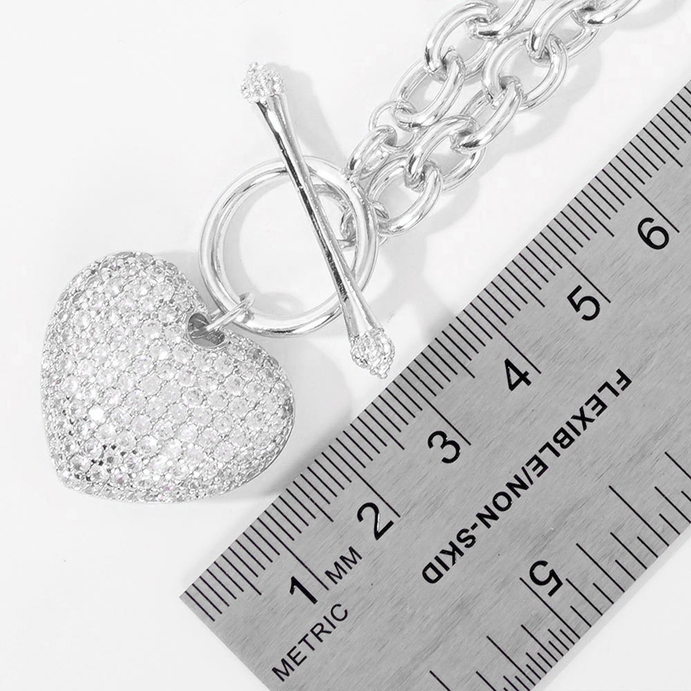 White Gold Dipped CZ Pave Heart Charm Toggle Bracelet