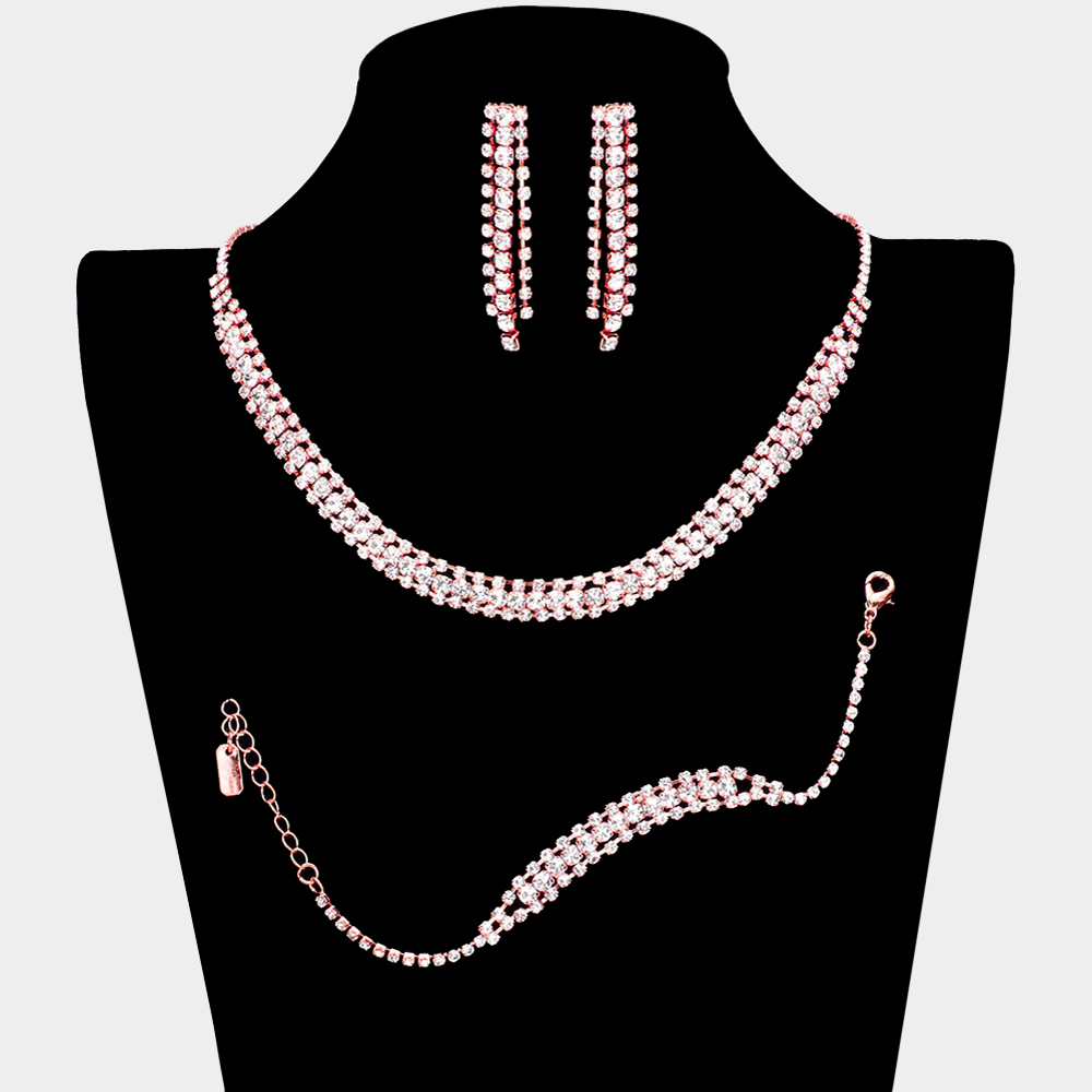 • Elevate your style with this elegant rhinestone jewelry set, featuring a sparkling necklace, matching bracelet, and drop earrings. Perfect for weddings, parties, or evening occasions, this coordinated trio adds timeless radiance and refined sophistication to any ensemble.