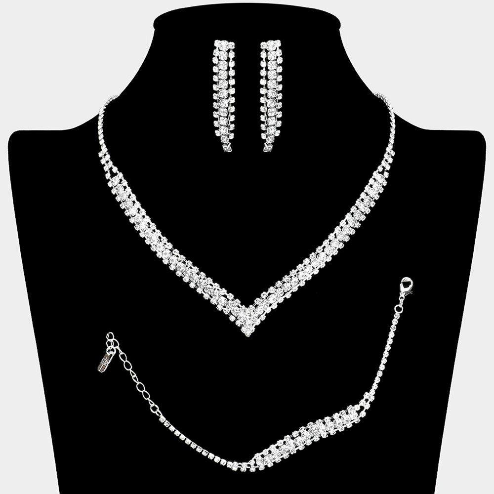 Details • Necklace Size : 16" + 4" L • Decor Size : 0.5" L • Bracelet Size : 0.3" H, 7" + 2" L • Earrings Size : 2" L • Elevate any special occasion with this refined jewelry set featuring a matching necklace, bracelet, and earrings. Its sparkling rhinestone arrangement creates a cohesive, eye-catching look designed to enhance formal outfits with timeless sophistication and graceful shine.