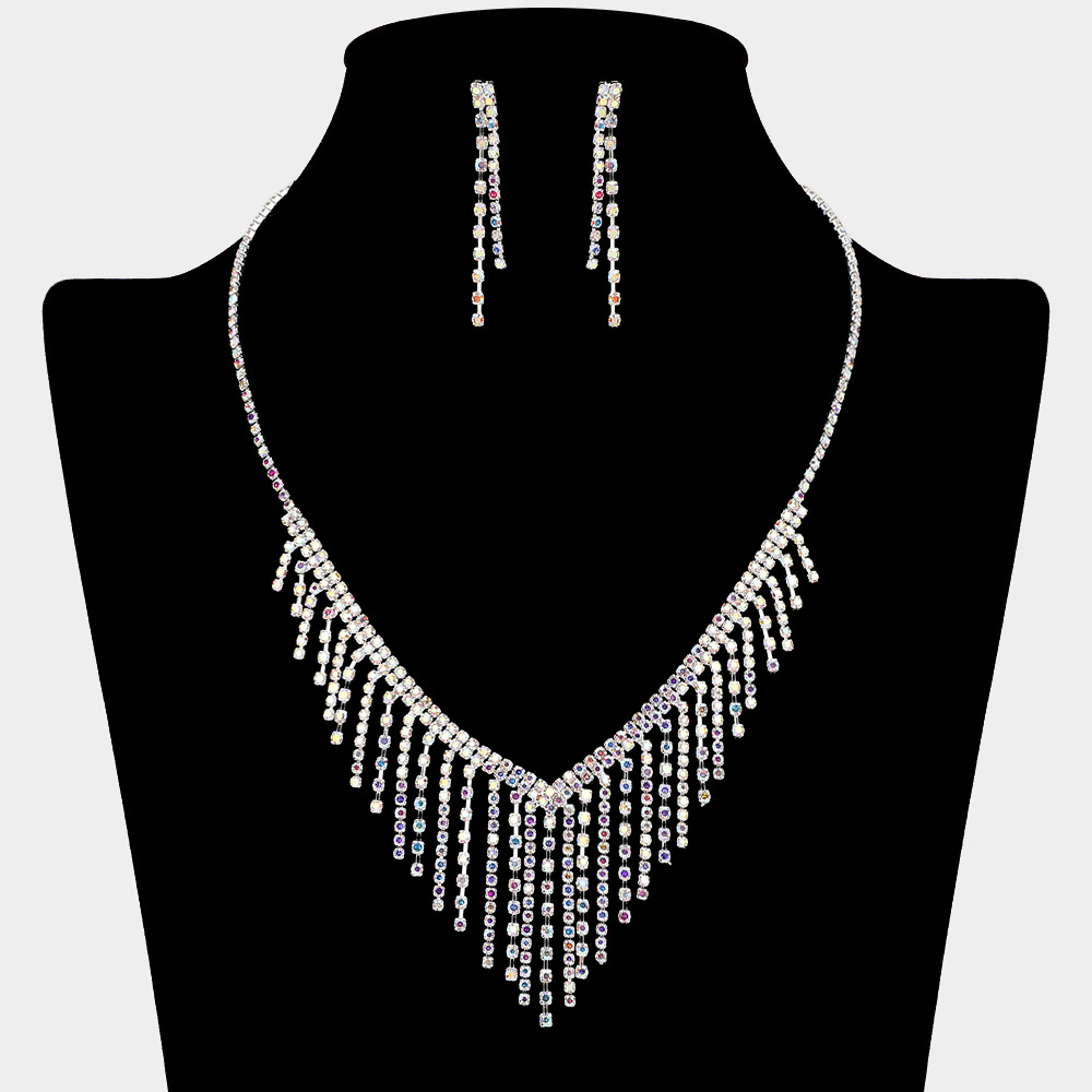 Details • Necklace Size : 17" + 4" L • Decor Size : 1.8" L • Earrings Size : 1.8" L • Add a touch of dramatic elegance with this Cascading Fringe Crystal Necklace and Earring Set. Designed with layered strands of shimmering stones that flow beautifully, this statement set enhances evening gowns and formal attire with radiant sparkle and sophisticated allure for any special occasion. • Lead and Nickel Compliant