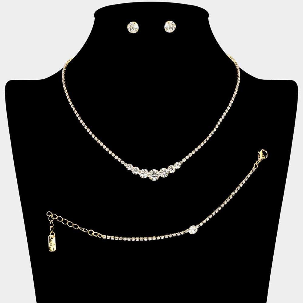 • Timeless matching necklace, stud earring, and bracelet set designed with a clean round stone centerpiece for effortless elegance. Ideal for weddings, formal events, parties, and everyday special occasion styling. A versatile set that delivers refined sparkle and coordinated sophistication.