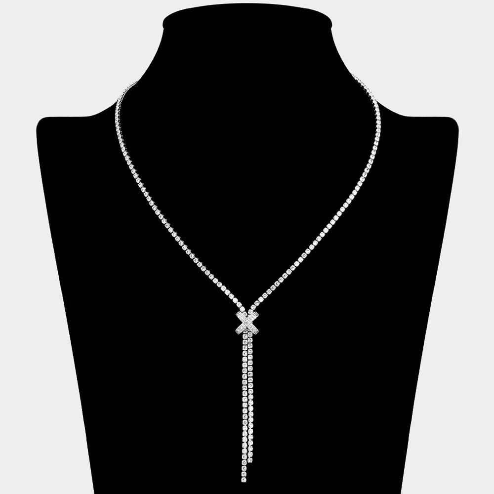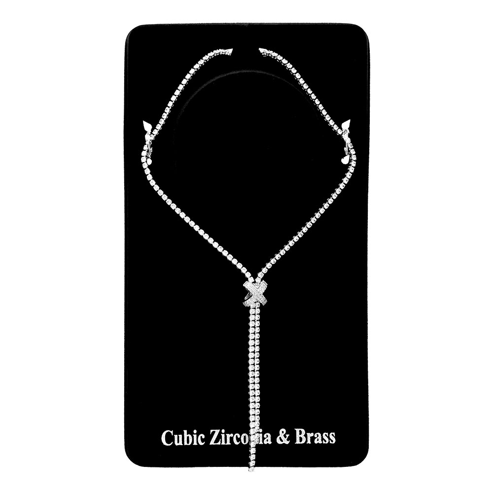 Details • Necklace Size : 16" + 2" L • Decor Size : 3" L • A refined Y-drop necklace featuring a sparkling X centerpiece with cascading strands for a graceful finish. Perfect for evening wear, weddings, or special occasions, this elegant piece adds sophistication and modern glamour to any outfit. • Brass • CZ Cubic Zirconia