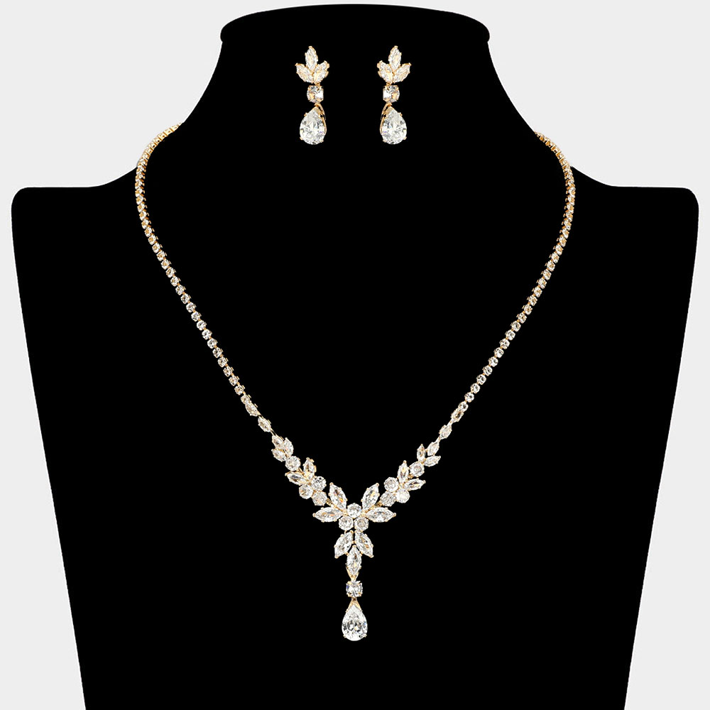 • This floral teardrop jewelry set showcases a dazzling crystal necklace paired with matching earrings, designed for timeless sophistication. The intricate floral motifs and shimmering stones create a radiant look, making it ideal for weddings, galas, and other elegant occasions.