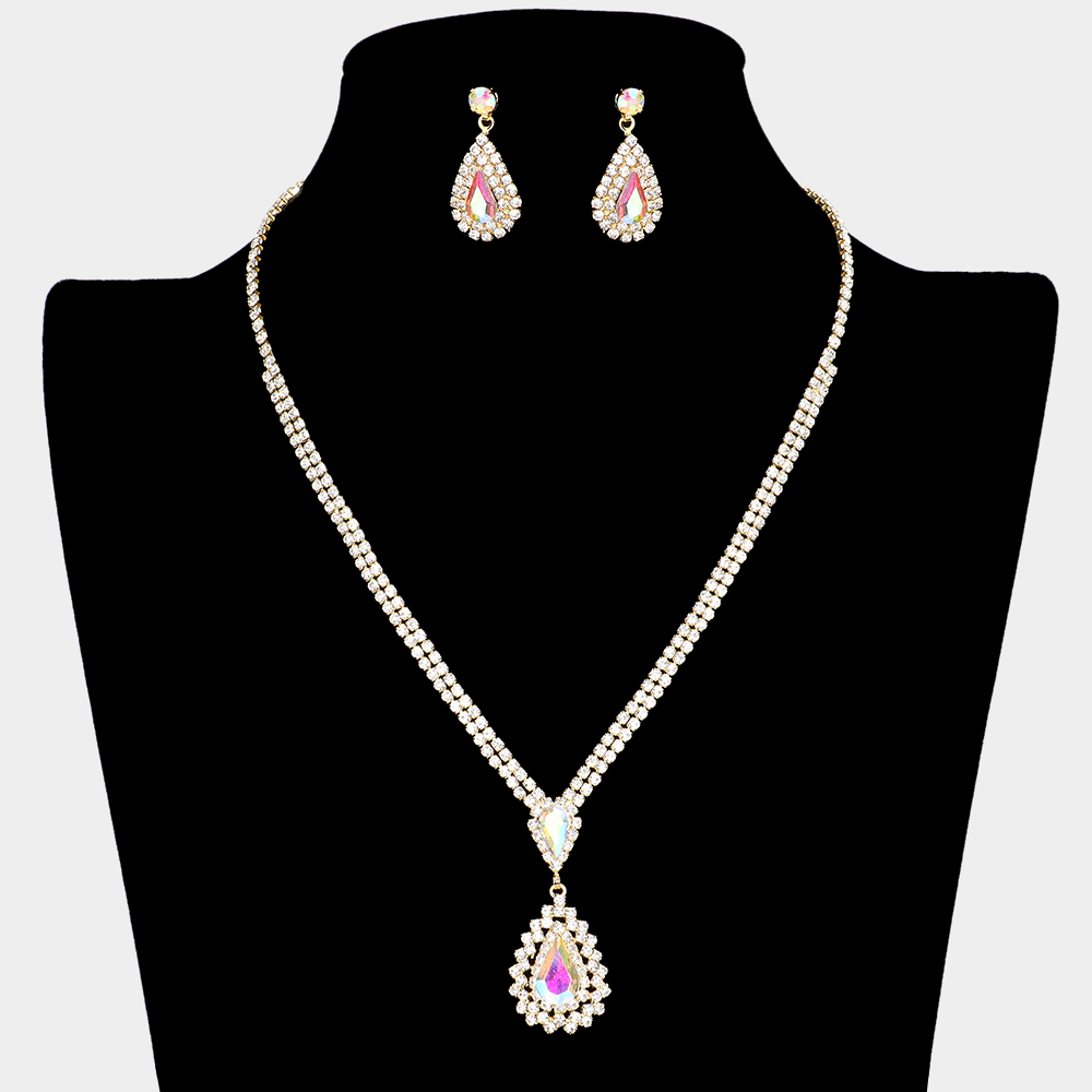 Details • Necklace Size : 16.5" + 4" L • Decor Size : 1.75" L • Earring Size : 1.2" L • Elegant teardrop pendant necklace and matching earrings featuring radiant stones and refined detailing. Perfect for weddings, proms, and evening occasions, this jewelry set adds graceful sparkle and timeless charm, completing your look with a touch of sophisticated glamour.
