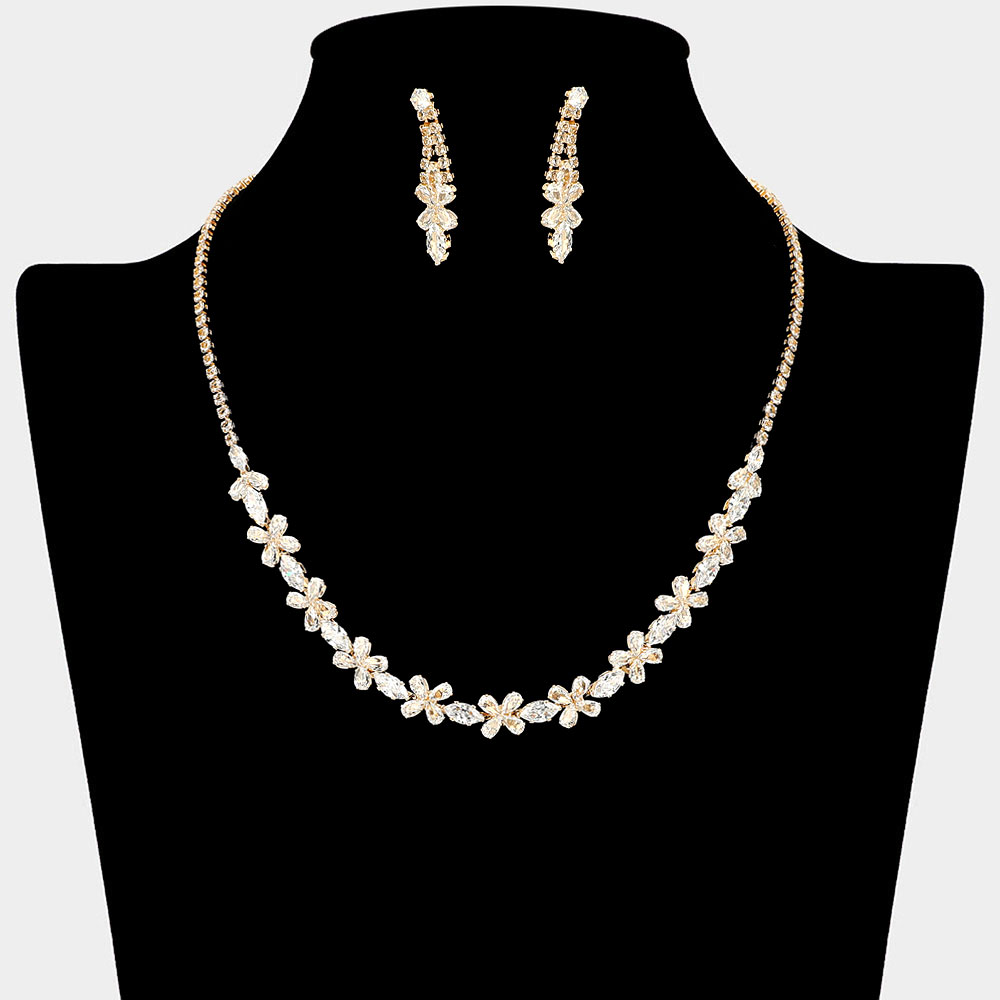 Details • Necklace Size : 16" + 4" L • Decor Size : 0.3" L • Earrings Size : 1.4" L • Dainty crystal cz flower necklace and matching drop earring set with sparkling floral accents. A timeless jewelry set ideal for weddings, proms, parties, or adding a graceful touch to elegant evening looks. • CZ Cubic Zirconia