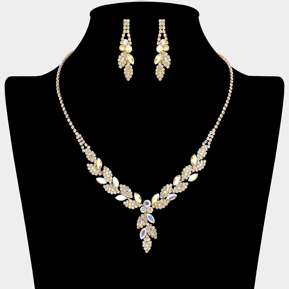 • This elegant necklace and earring set showcases a graceful leaf-inspired design with layered crystal accents and a refined drop silhouette. Perfect for weddings, formal events, proms, and special occasions, it delivers eye-catching sparkle and balanced elegance that enhances evening gowns, bridal looks, and statement outfits.