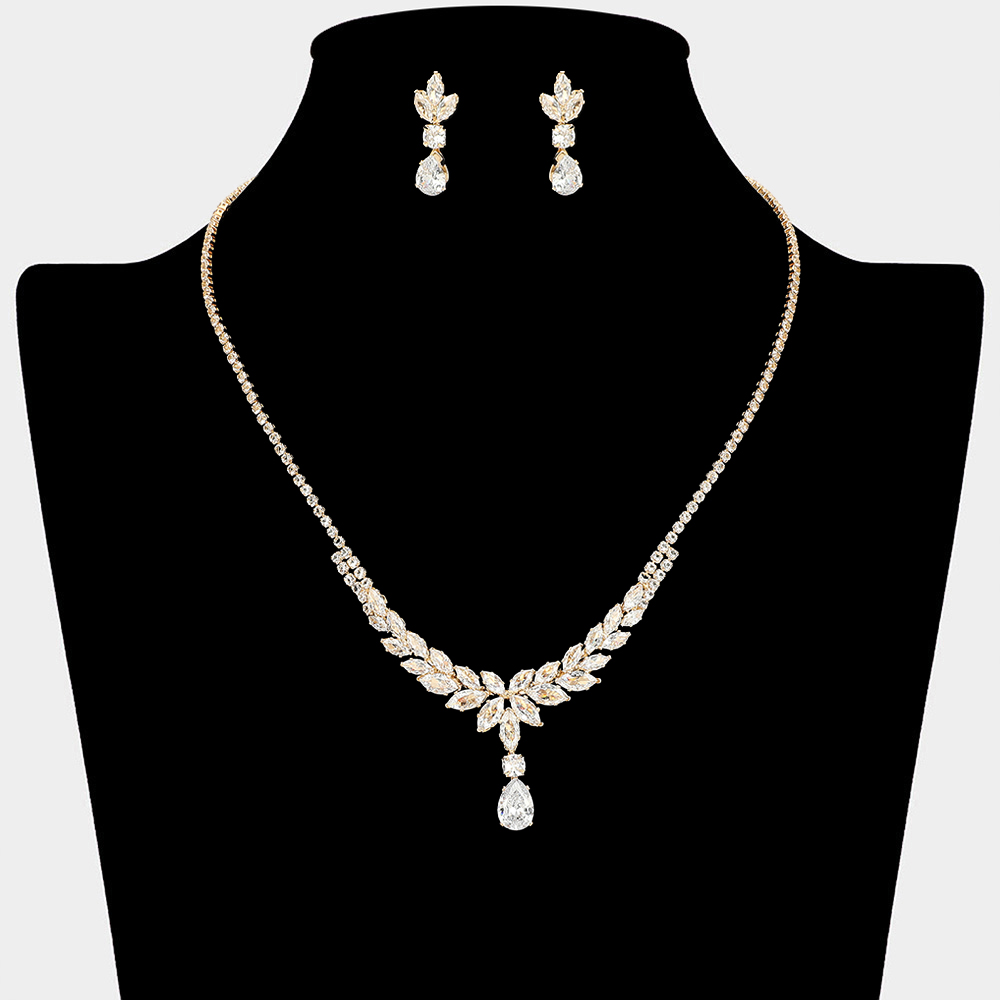 • This elegant necklace and earring set features a refined leaf-inspired design with marquise and teardrop crystal accents that create graceful sparkle and movement. Ideal for bridal wear, formal events, and evening occasions, this statement set adds timeless sophistication and a polished finish to dresses and gowns.