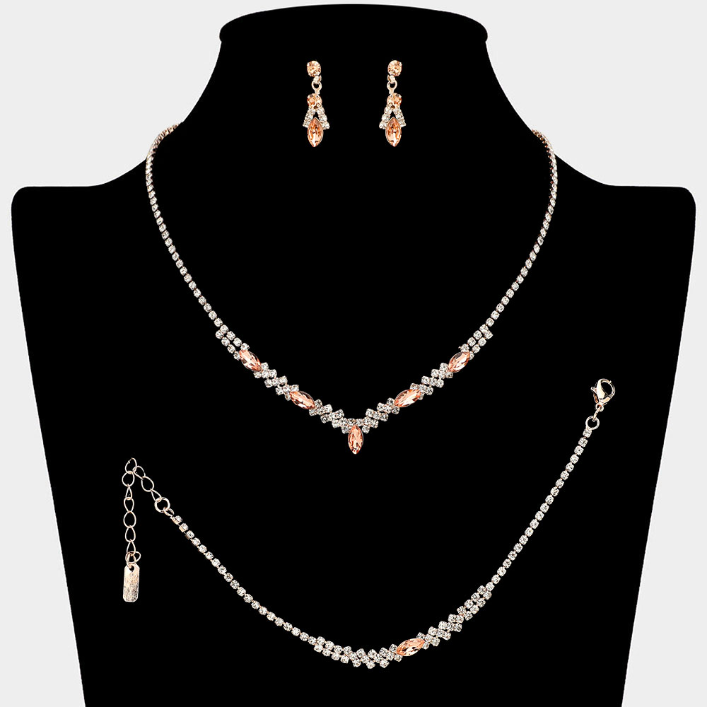 • Shine with timeless elegance in this crystal jewelry set featuring a delicate necklace, matching bracelet, and sparkling drop earrings. Designed with refined detailing, it adds a graceful touch to formal looks, perfect for weddings, galas, or special evening occasions.