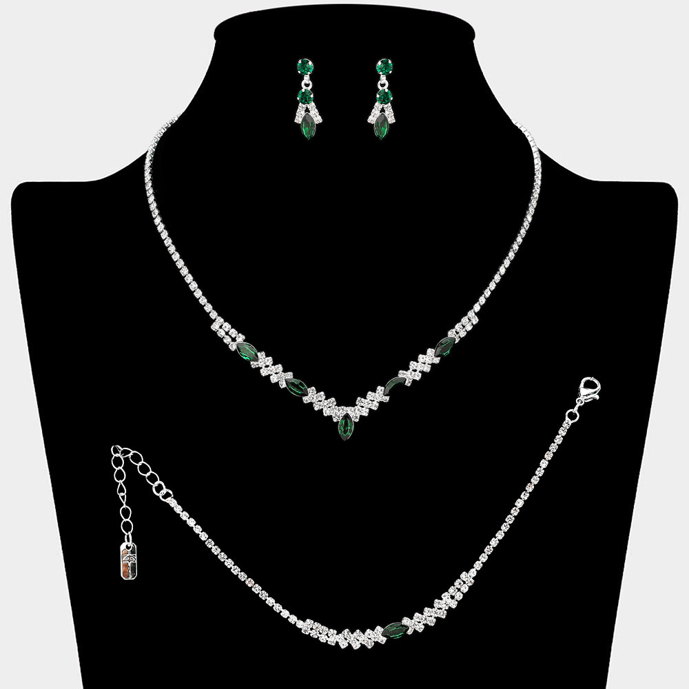 • Shine with timeless elegance in this crystal jewelry set featuring a delicate necklace, matching bracelet, and sparkling drop earrings. Designed with refined detailing, it adds a graceful touch to formal looks, perfect for weddings, galas, or special evening occasions.