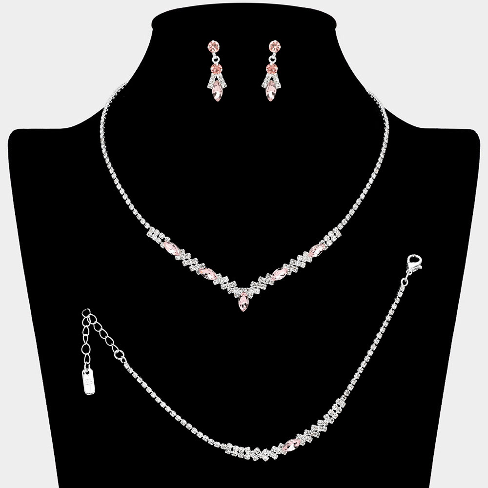 • Shine with timeless elegance in this crystal jewelry set featuring a delicate necklace, matching bracelet, and sparkling drop earrings. Designed with refined detailing, it adds a graceful touch to formal looks, perfect for weddings, galas, or special evening occasions.