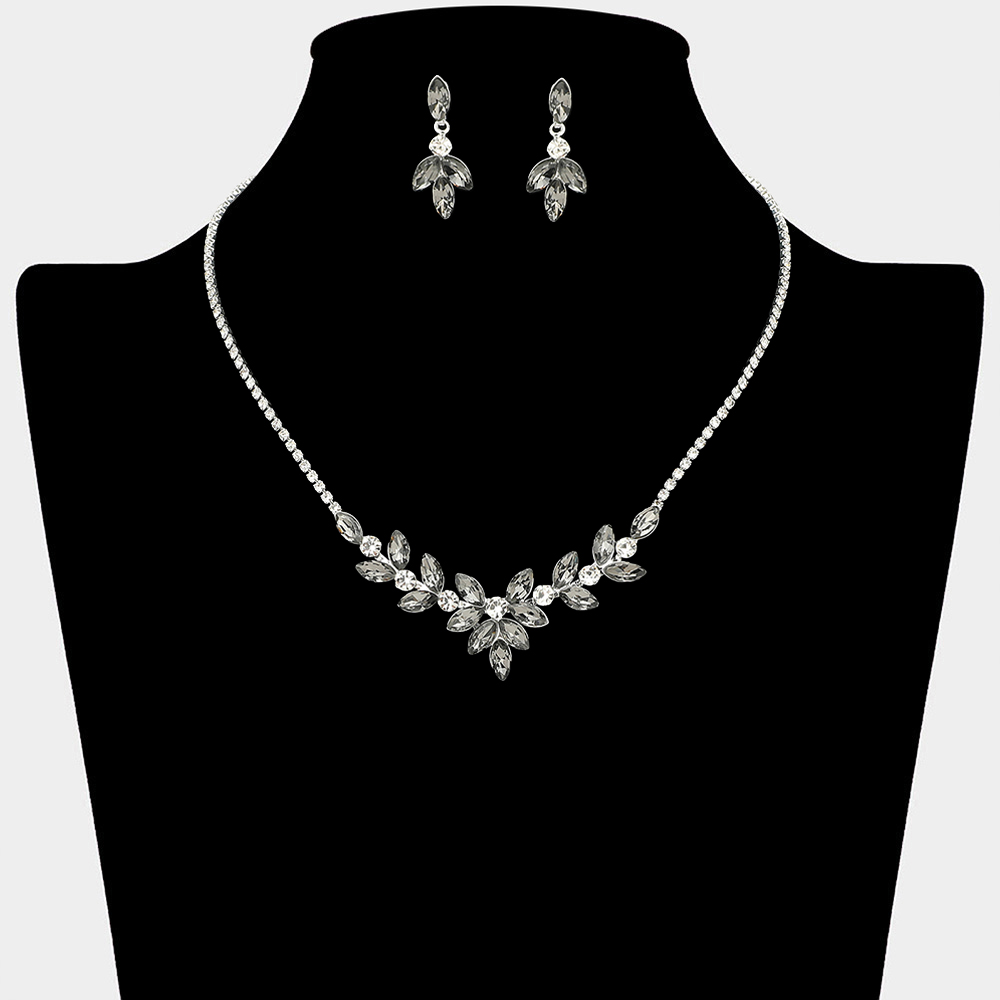 Details • Necklace Size : 15" + 4" L • Decor Size : 0.8" L • Earrings Size : 1.2" L • This refined necklace and matching earring set features a leaf-inspired crystal arrangement that frames the neckline with elegant sparkle. Designed for weddings, bridal parties, formal events, and evening wear, it offers a graceful statement look that enhances dresses, gowns, and special occasion styling with timeless appeal.