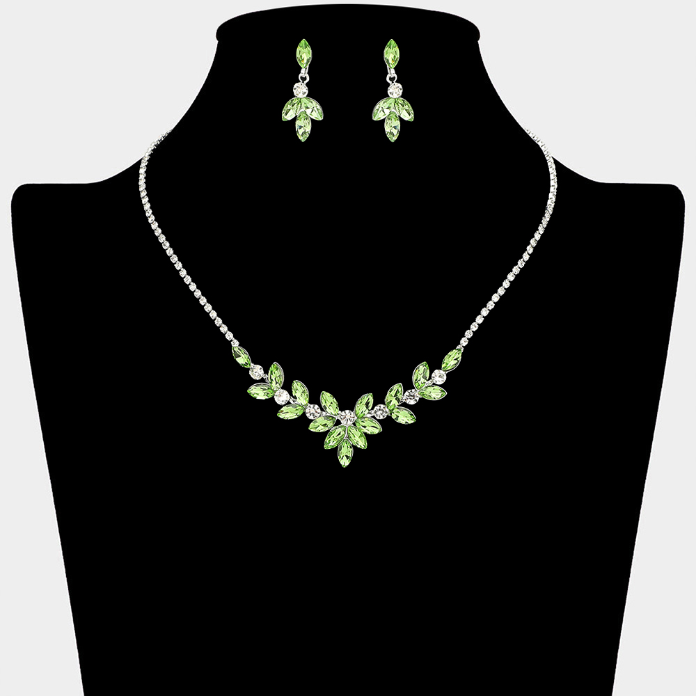 • This refined necklace and matching earring set features a leaf-inspired crystal arrangement that frames the neckline with elegant sparkle. Designed for weddings, bridal parties, formal events, and evening wear, it offers a graceful statement look that enhances dresses, gowns, and special occasion styling with timeless appeal.