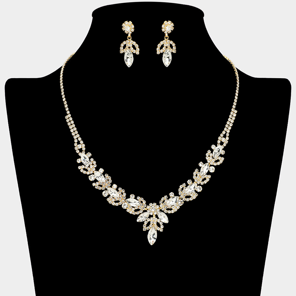 Details • Necklace Size : 16.5" + 4" L • Decor Size : 1.2' L • Earrings Size : 1.25" L • This statement necklace and matching earring set showcases cascading leaf and drop details in a symmetrical design that frames the neckline beautifully. Ideal for weddings, formal events, evening wear, and special occasions, it delivers refined sparkle and a polished finish to elevated looks.