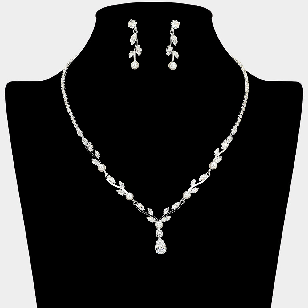Details • Necklace Size : 16" + 4" L • Decor Size : 0.8" L • Earrings Size : 1.25" L • Elegant necklace and earring set featuring a refined drop centerpiece with soft detailing for a graceful look. Perfect for weddings, bridal styling, formal events, and evening wear. A timeless set designed to add subtle sophistication and polished charm to special occasions. • CZ Cubic Zirconia