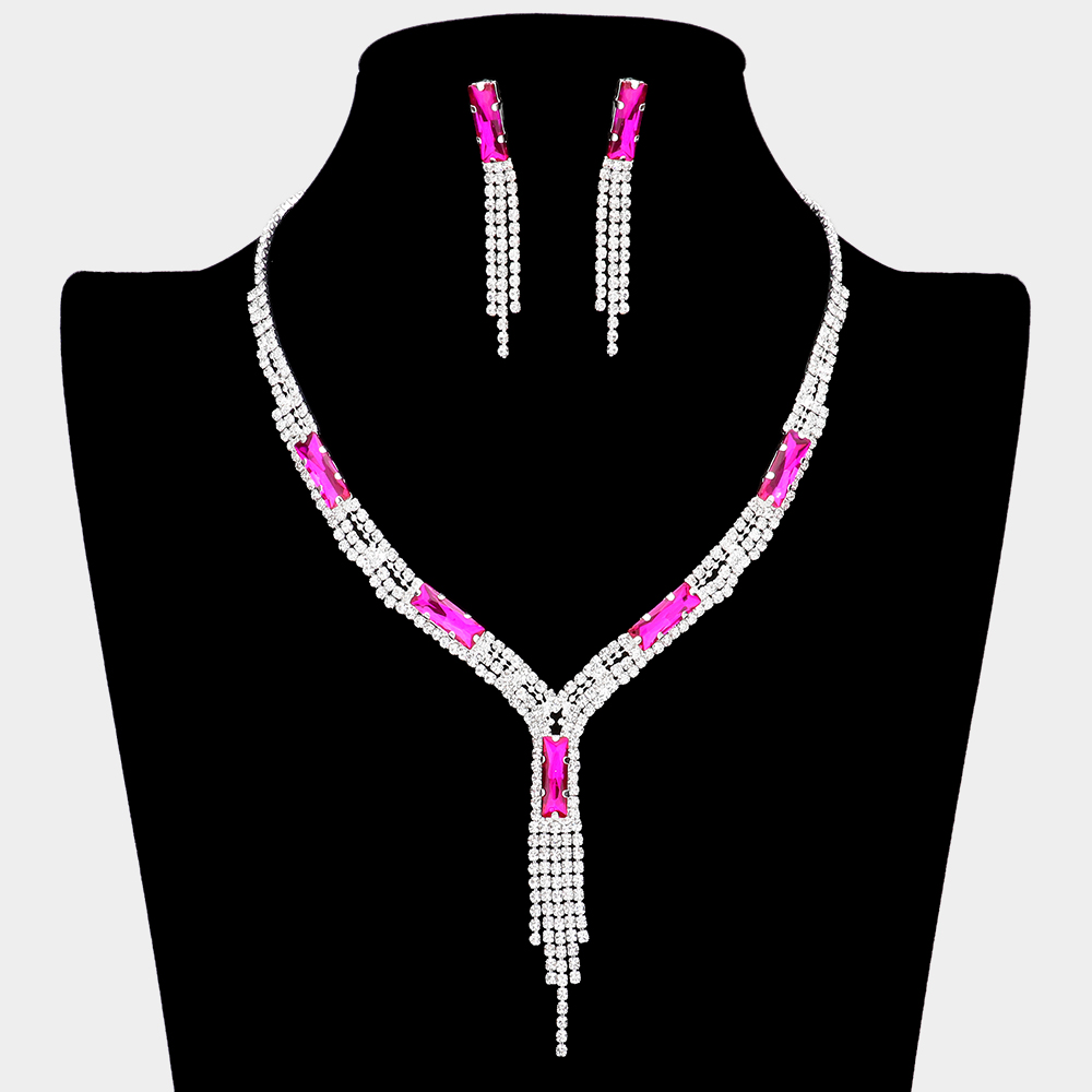 Rectangle Stone Accented Rhinestone Fringe Tip Necklaces