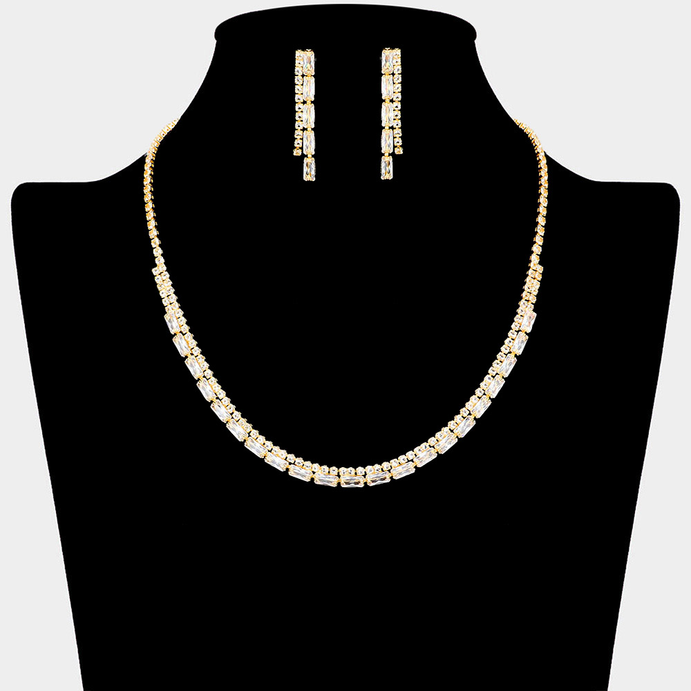 Details • Necklace Size : 16" L + 4" L • Decor Size : 0.25" L • Earring Size : 1.5" L • Elevate your look with this Baguette Crystal Necklace and Earring Set. Featuring sleek, rectangular stones that reflect light from every angle, this refined design adds a modern yet timeless touch—perfect for formal events, evening wear, or adding luxury to any special occasion.