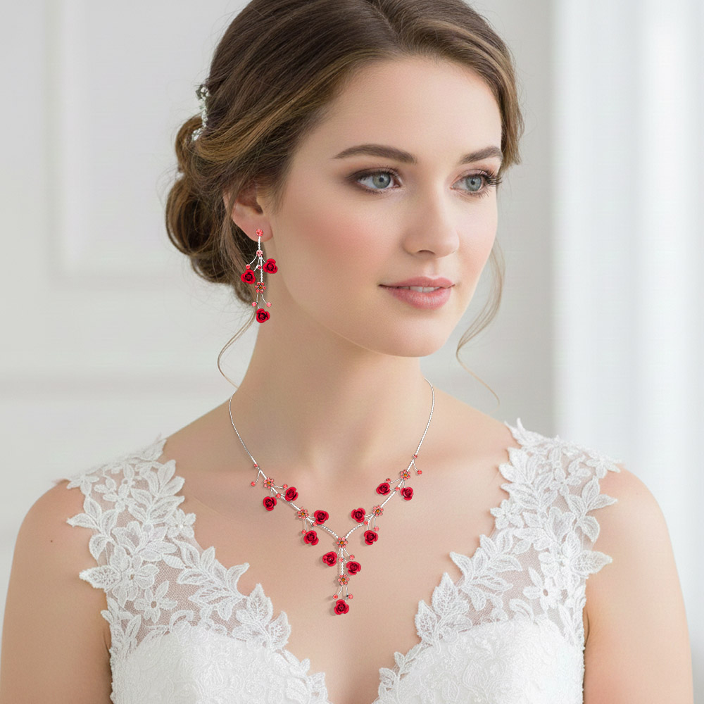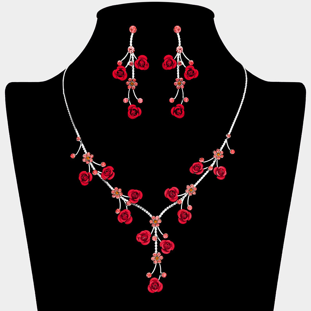 Details • Necklace Size : 14.5" + 4" L • Decor Size : 2" L • Earring Size : 2.25" L • Elevate your look with this elegant floral necklace and earring set. Featuring delicate flower accents and a graceful design, this jewelry set adds a refined charm to both special occasions and everyday wear, making it a must-have accessory for timeless sophistication.