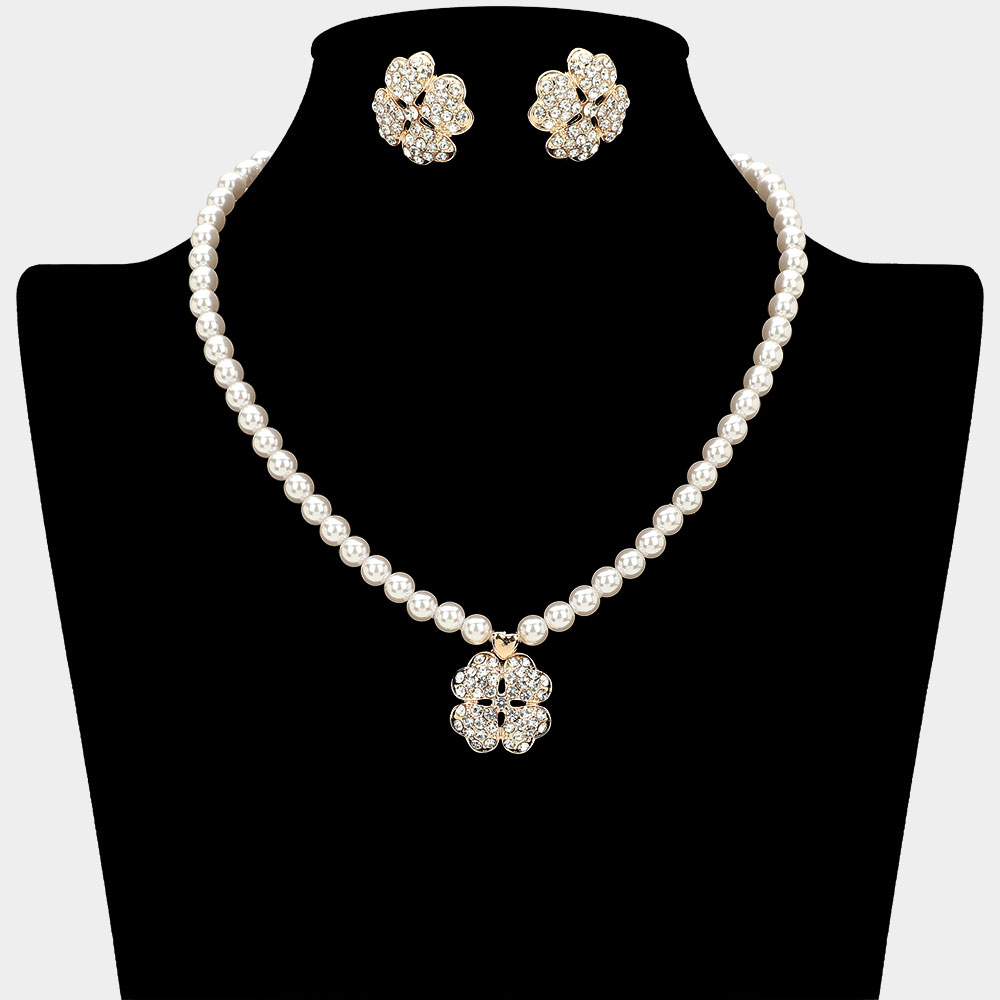 Details • Necklace Size : 15.5" + 3.75" L • Pendant Size : 0.75" X 0.8" • Earrings Size : 0.8" L • Classic pearl necklace and earring set with a sparkling floral pendant and matching flower studs. A graceful design perfect for formal occasions, weddings, or elegant evening ensembles.