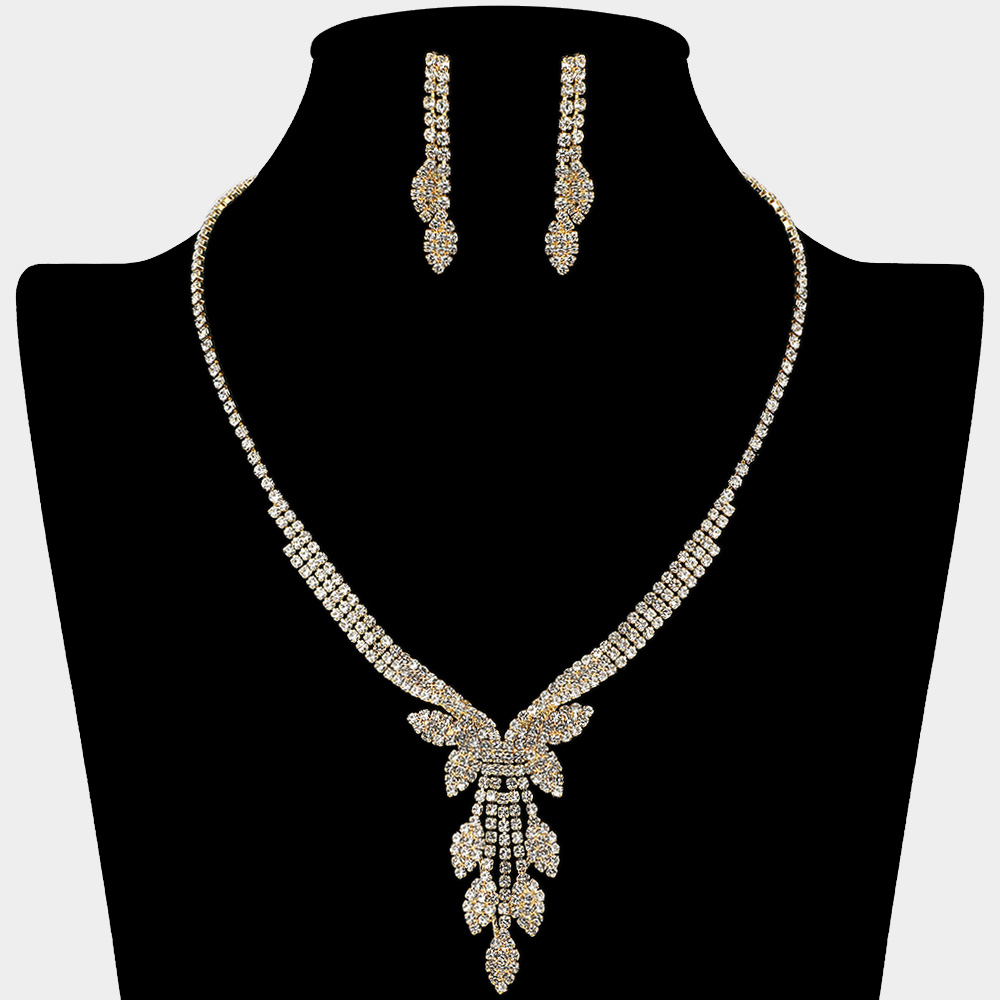 • This elegant rhinestone necklace and earring set showcases a dazzling leaf drop design with iridescent shimmer that catches every light. Perfect for formal events, weddings, or evening wear, it adds radiant sophistication and a graceful sparkle to elevate any special occasion look.