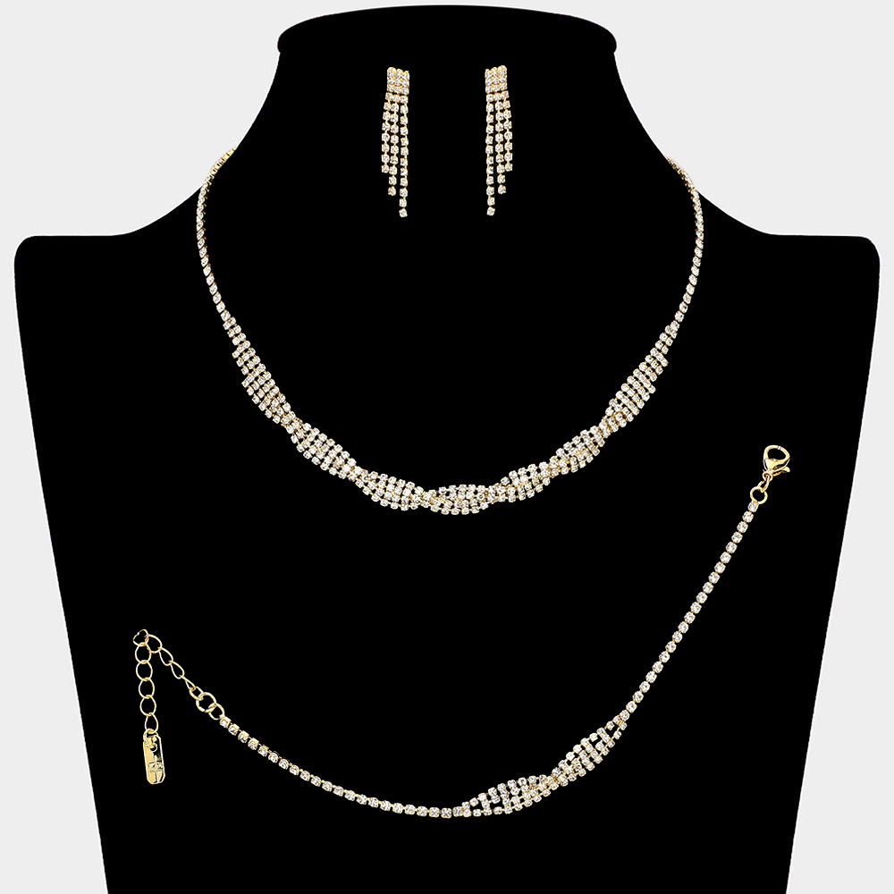 • Sophisticated matching necklace, drop earring, and bracelet set designed with a refined layered silhouette for a polished finish. Ideal for weddings, formal events, parties, and evening wear. A timeless coordinated set that delivers graceful sparkle and elevated special occasion styling.