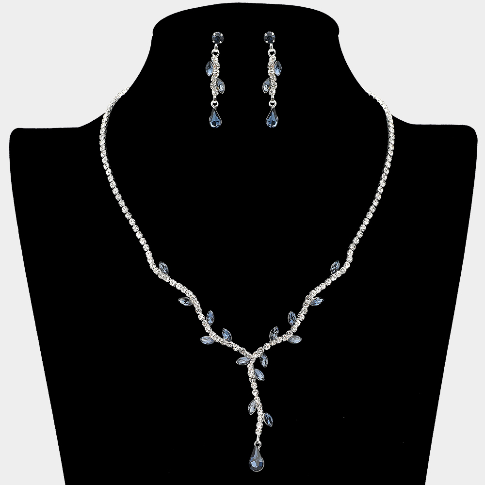 • Elegant necklace and earring set with shimmering leaf-shaped stones and a delicate drop pendant. Perfect for weddings, proms, and special events for a refined and glamorous look.