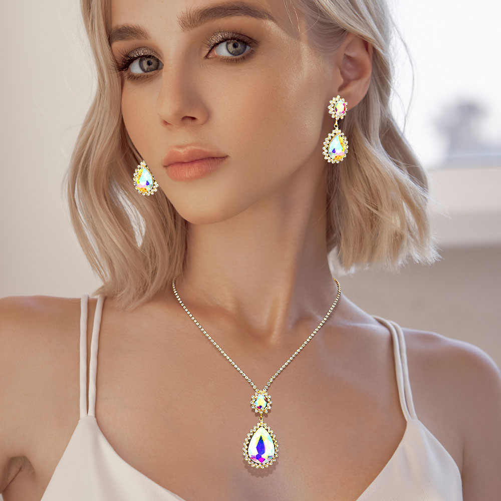 Details • Necklace Size : 13" + 4" L • Decor Size : 2" L • Earring Size : 1.75" L • Discover timeless elegance with this teardrop crystal necklace and earring set. Featuring a radiant teardrop centerpiece with matching earrings, it’s the perfect choice for weddings, proms, and special occasions. Add sophistication and sparkle to your evening look.