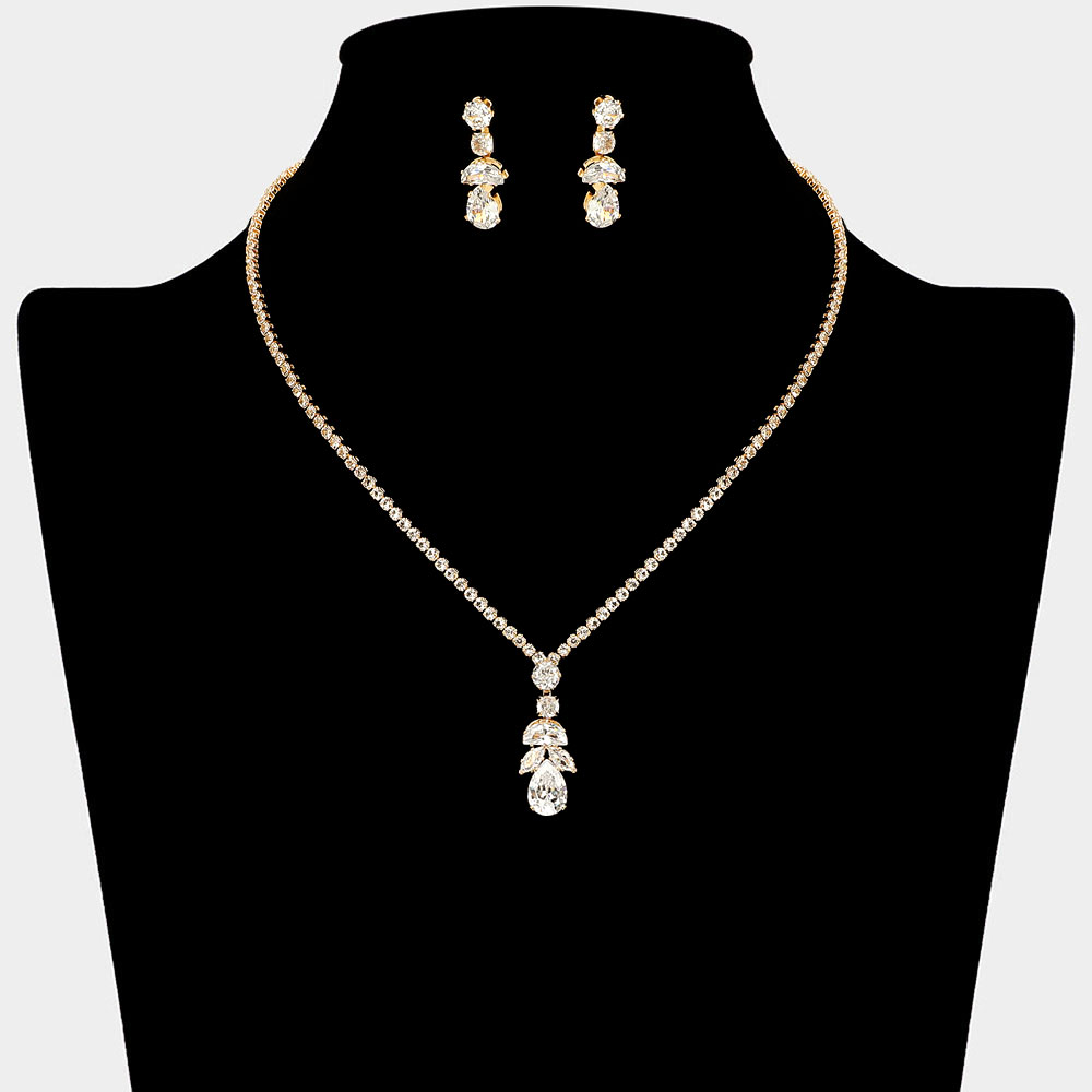 Details • Necklace Size : 14.5" + 4" L • Decor Size : 1.2" L • Earrings Size : 0.9" L • Enhance your look with this elegant teardrop necklace and earring set. Designed to captivate with its refined sparkle and timeless charm, this jewelry set adds sophistication and grace to any occasion, making it a perfect choice for both formal and special events. • CZ Cubic Zirconia