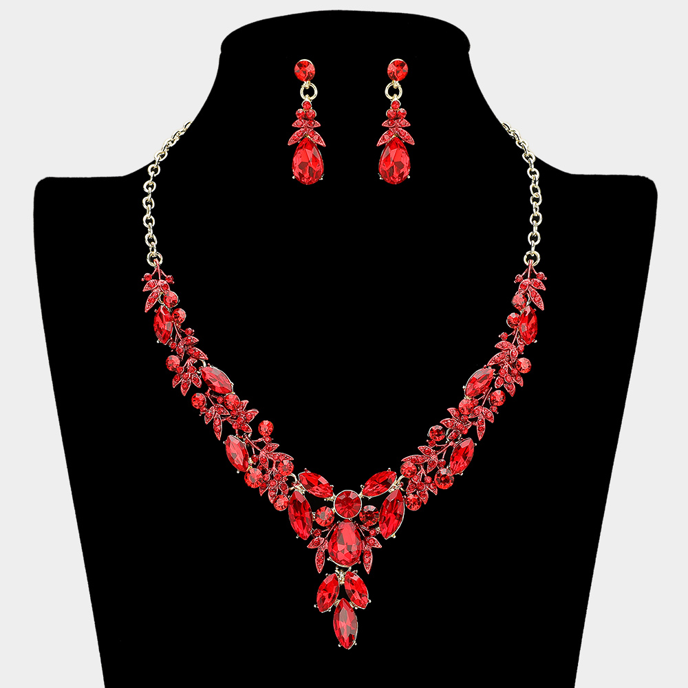 • Glamorous jewelry set featuring an intricate rhinestone statement necklace with cascading teardrop/leaf designs and matching dangle earrings. Perfect for bridal, prom, or formal events.