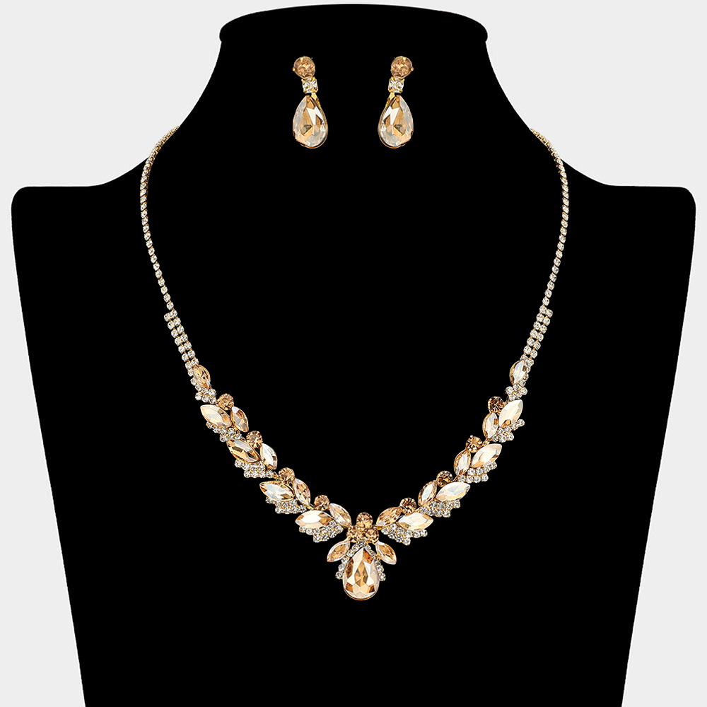 • This elegant statement necklace and matching earring set features layered teardrop accents that create a dramatic yet refined silhouette. Designed to highlight the neckline with graceful sparkle, it is ideal for formal occasions, bridal styling, evening events, and upscale boutique collections.