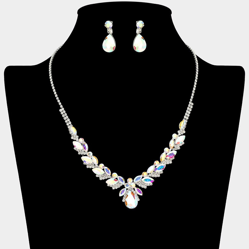 • This elegant statement necklace and matching earring set features layered teardrop accents that create a dramatic yet refined silhouette. Designed to highlight the neckline with graceful sparkle, it is ideal for formal occasions, bridal styling, evening events, and upscale boutique collections.