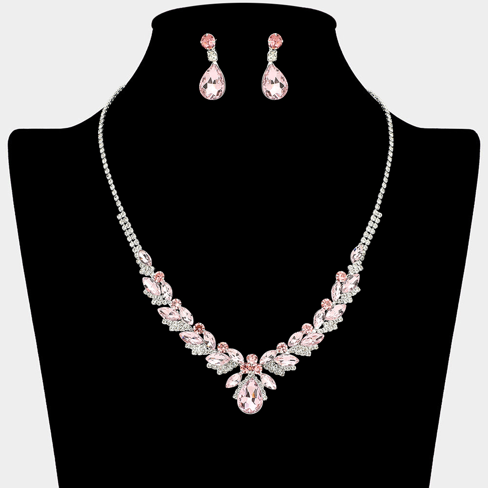 • This elegant statement necklace and matching earring set features layered teardrop accents that create a dramatic yet refined silhouette. Designed to highlight the neckline with graceful sparkle, it is ideal for formal occasions, bridal styling, evening events, and upscale boutique collections.