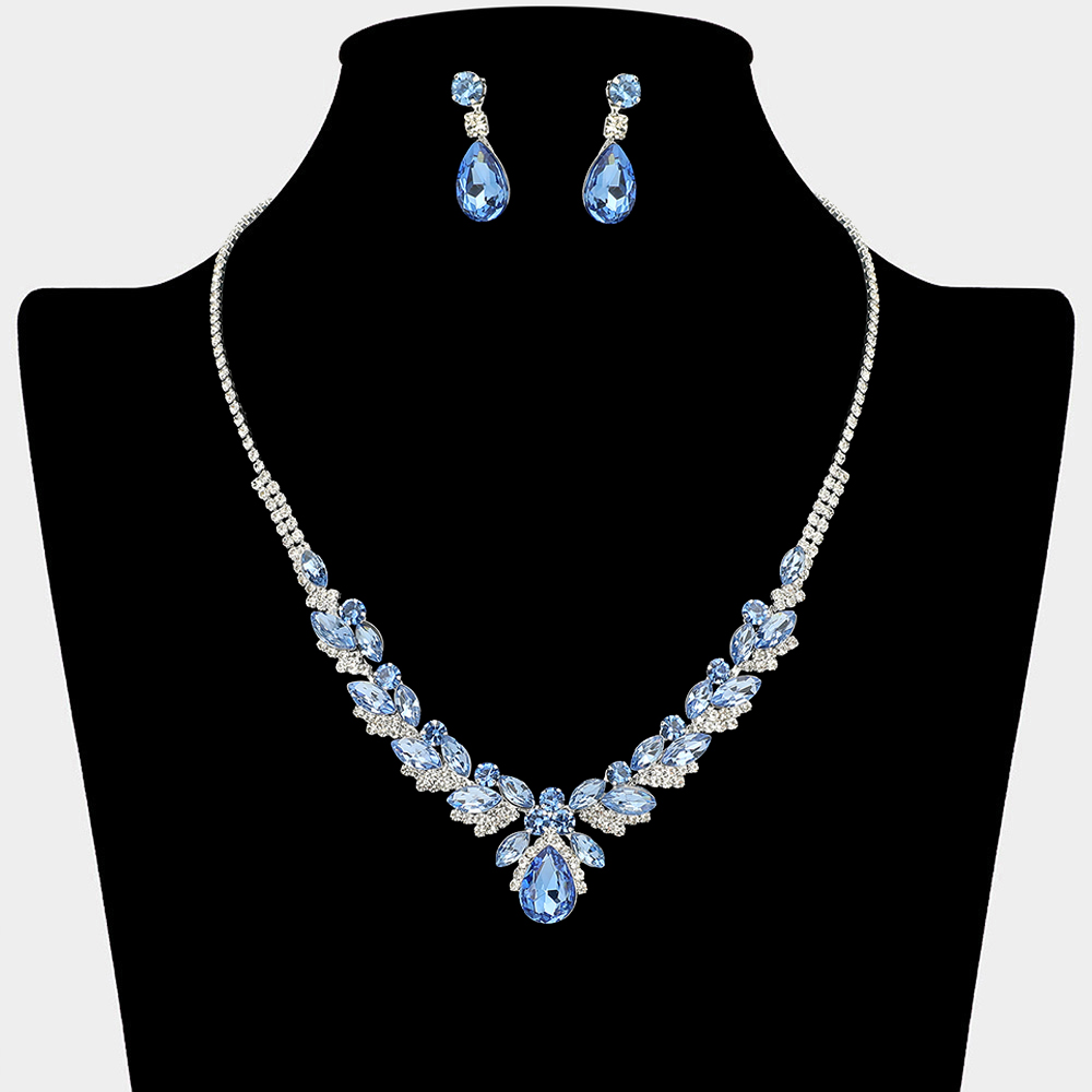 • This elegant statement necklace and matching earring set features layered teardrop accents that create a dramatic yet refined silhouette. Designed to highlight the neckline with graceful sparkle, it is ideal for formal occasions, bridal styling, evening events, and upscale boutique collections.