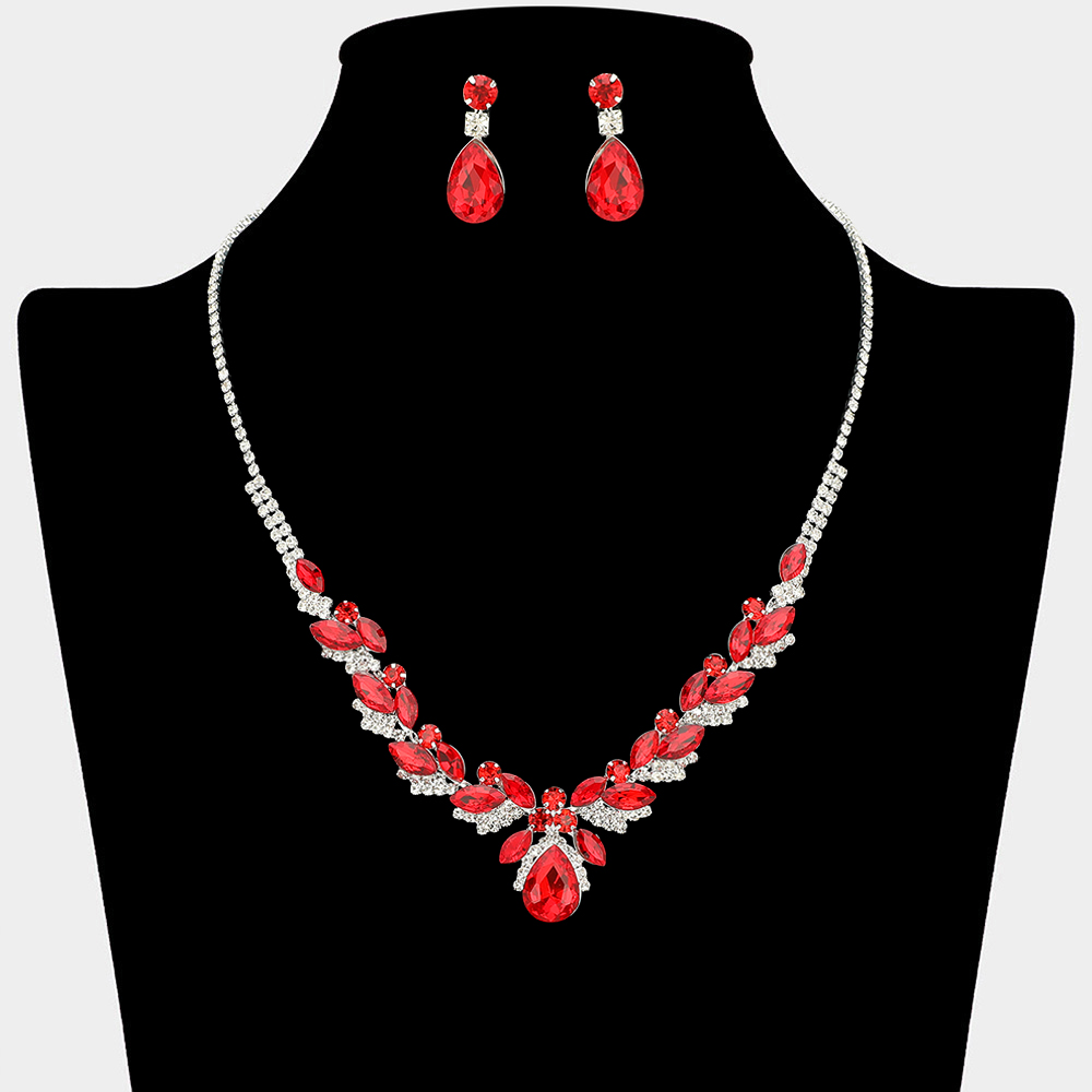 • This elegant statement necklace and matching earring set features layered teardrop accents that create a dramatic yet refined silhouette. Designed to highlight the neckline with graceful sparkle, it is ideal for formal occasions, bridal styling, evening events, and upscale boutique collections.