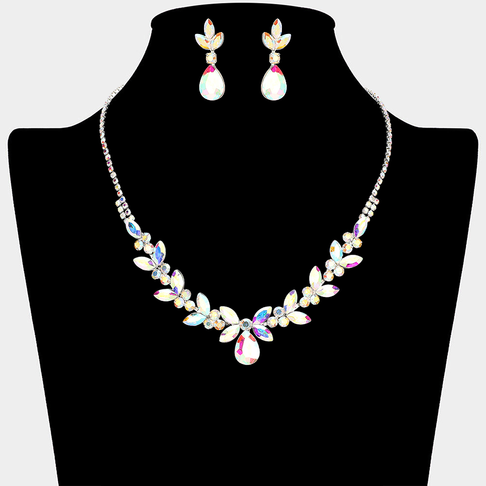 • This elegant necklace and matching earring set features a leaf-inspired design with a graceful drop centerpiece that frames the neckline beautifully. Perfect for weddings, formal events, proms, and evening occasions, it adds refined sparkle and a timeless statement to special occasion looks.