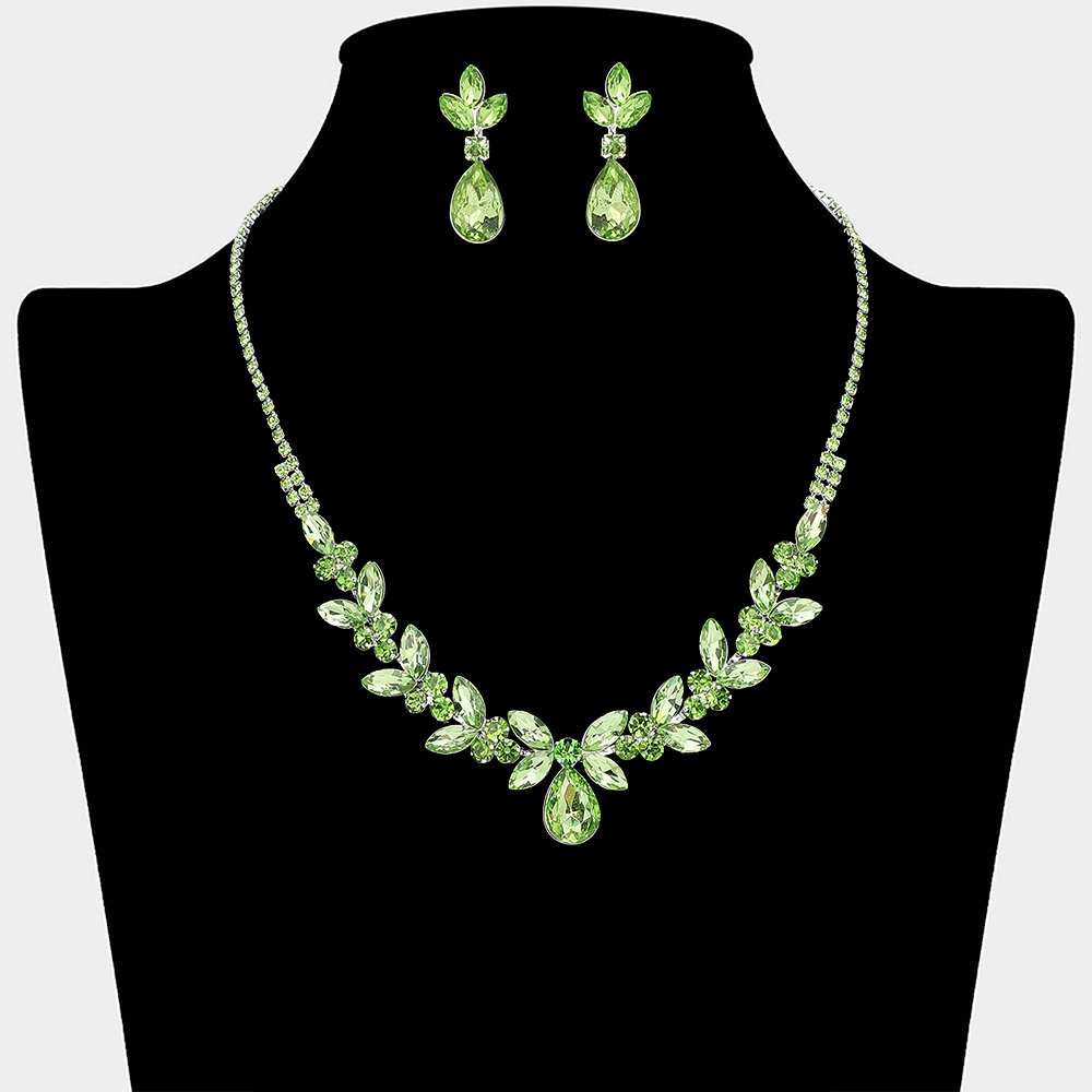 • This elegant necklace and matching earring set features a leaf-inspired design with a graceful drop centerpiece that frames the neckline beautifully. Perfect for weddings, formal events, proms, and evening occasions, it adds refined sparkle and a timeless statement to special occasion looks.