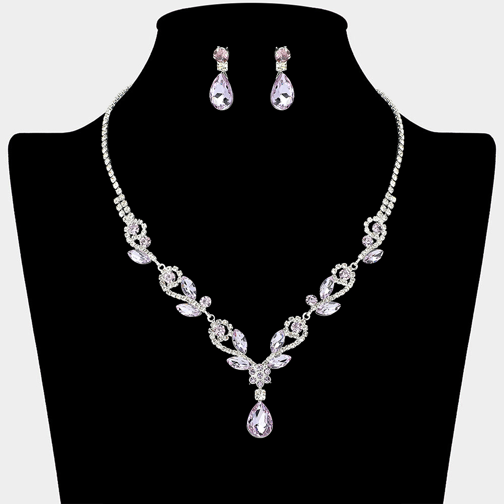 Details • Necklace Size : 16" + 4.5" L • Decor Size : 1.24" L • Earrings Size : 1" L • This elegant necklace and matching earring set features a graceful teardrop design with layered crystal details that highlight the neckline beautifully. Ideal for weddings, formal events, proms, and evening occasions, it delivers timeless elegance and eye-catching sparkle for special celebrations.