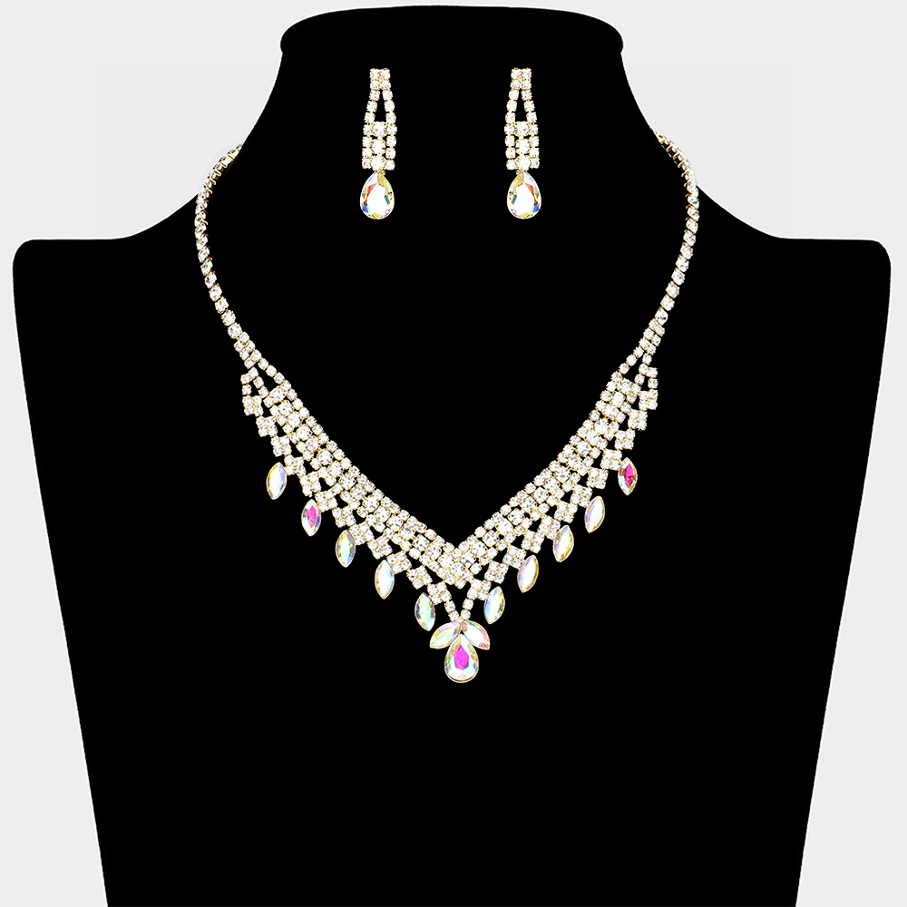 Details • Necklace Size : 14.5" + 3.75" L • Decor Size : 1.1" L • Earring Size : 1.25" L • Add radiant charm to your look with this rhinestone necklace and earring set featuring teardrop accents and intricate detailing. Designed for weddings, proms, and elegant evenings, this jewelry set brings brilliance and refinement to any special occasion ensemble. • Lead and Nickel Compliant