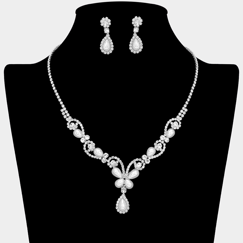 • This elegant necklace and earring set features a refined drop silhouette accented with luminous pearl-style details and sparkling crystal elements. Designed to elevate bridal looks, weddings, proms, and formal occasions, it adds graceful movement and timeless sophistication to evening gowns and special event styling.