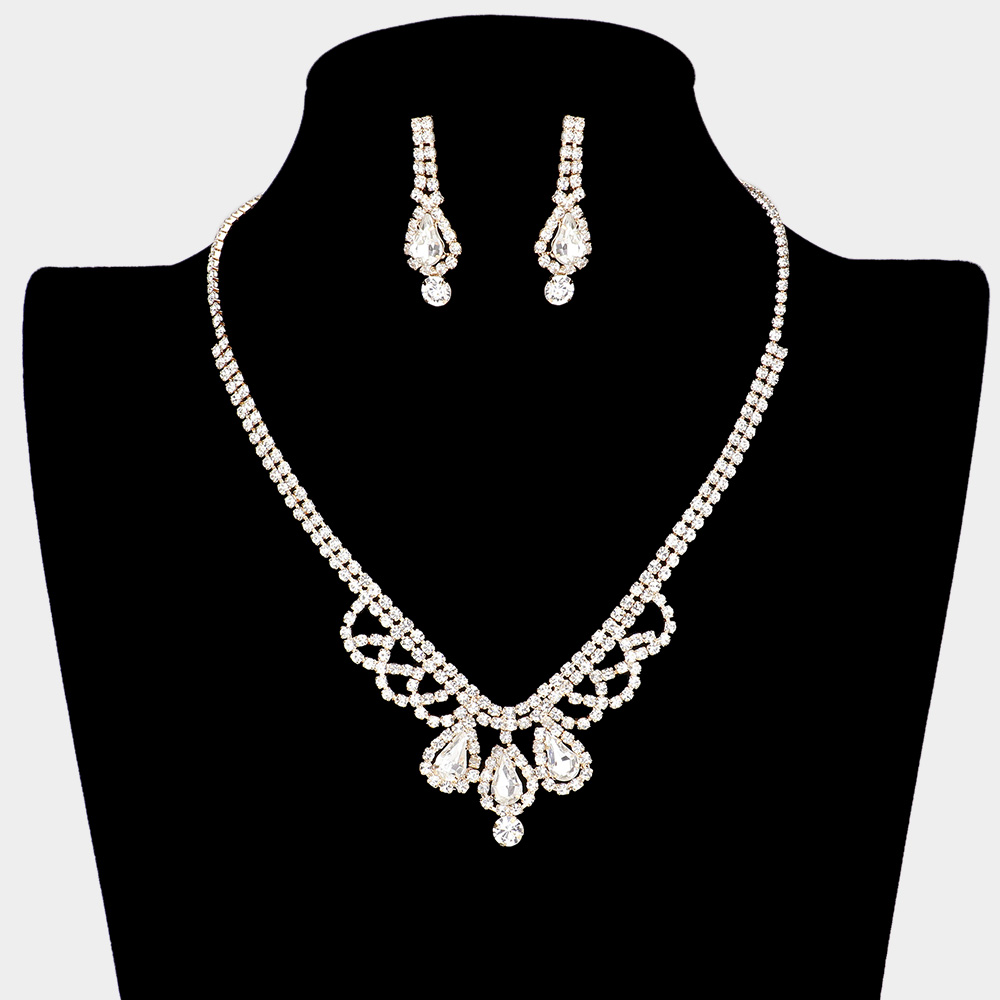 Details • Necklace Size : 15" L + 4" L • Decor Size : 1" L • Earring Size : 1.4" L • Complete your look with this elegant rhinestone teardrop necklace and earrings set. Featuring cascading teardrop pendants with sparkling accents, this timeless jewelry is ideal for weddings, proms, galas, or evening events, adding refined charm and brilliance to your special occasion style. • Lead and Nickel Compliant