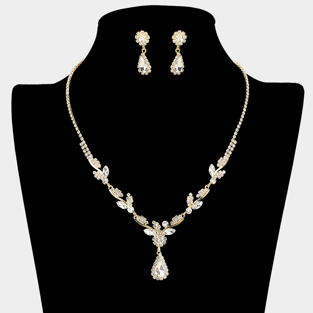Details • Necklace Size : 16" + 4.25" L • Decor Size : 1.5" L • Earrings Size : 1.1" L • Elegant jewelry set featuring a delicate rhinestone chain and a graceful V-shaped floral/leaf motif. Includes a striking teardrop crystal drop necklace and matching dangle earrings. Ideal for weddings, prom, and formal wear.