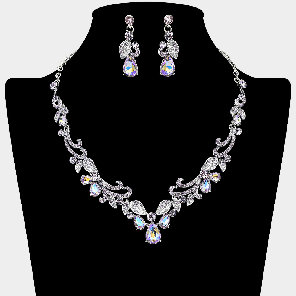 • Dazzling necklace and earring set featuring teardrop crystals with intricate leaf accents. Perfect for weddings, pageants, or evening events, this set adds a refined and elegant touch to any special occasion look.