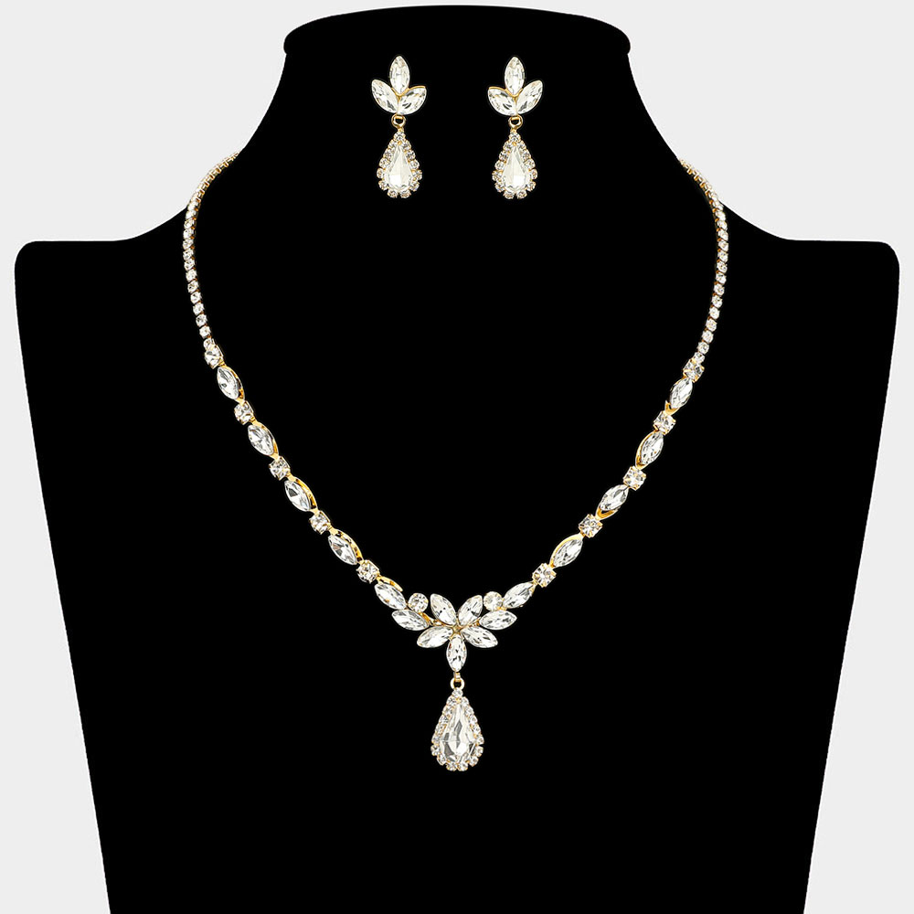 Details • Necklace Size : 15.5" + 4" L • Decor Size : 1.5" L • Earrings Size : 1.25" L • Elevate your elegance with this leaf drop necklace and earring set. Featuring a graceful arrangement of shimmering stones in a refined floral pattern, this jewelry set adds sophistication and sparkle to any look, making it ideal for weddings, celebrations, and formal occasions.