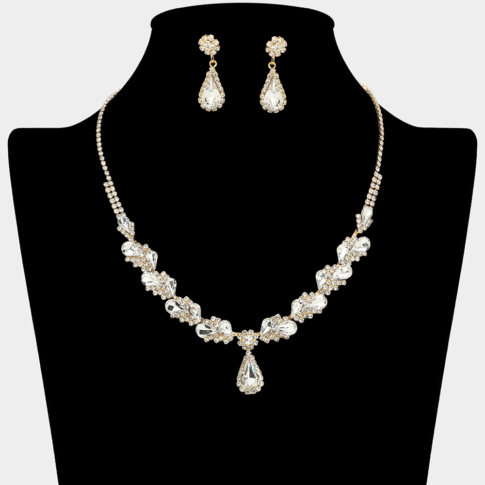 • This teardrop statement necklace and earring set features layered sparkle with elegant drop accents that frame the neckline beautifully. Designed for special occasions, formal events, and evening styling, it offers a refined coordinated look ideal for boutiques and gift-ready collections.
