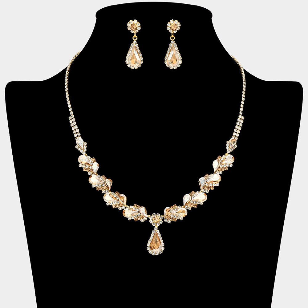• This teardrop statement necklace and earring set features layered sparkle with elegant drop accents that frame the neckline beautifully. Designed for special occasions, formal events, and evening styling, it offers a refined coordinated look ideal for boutiques and gift-ready collections.